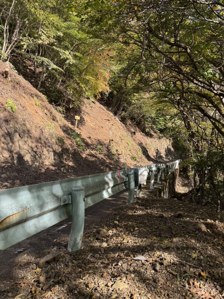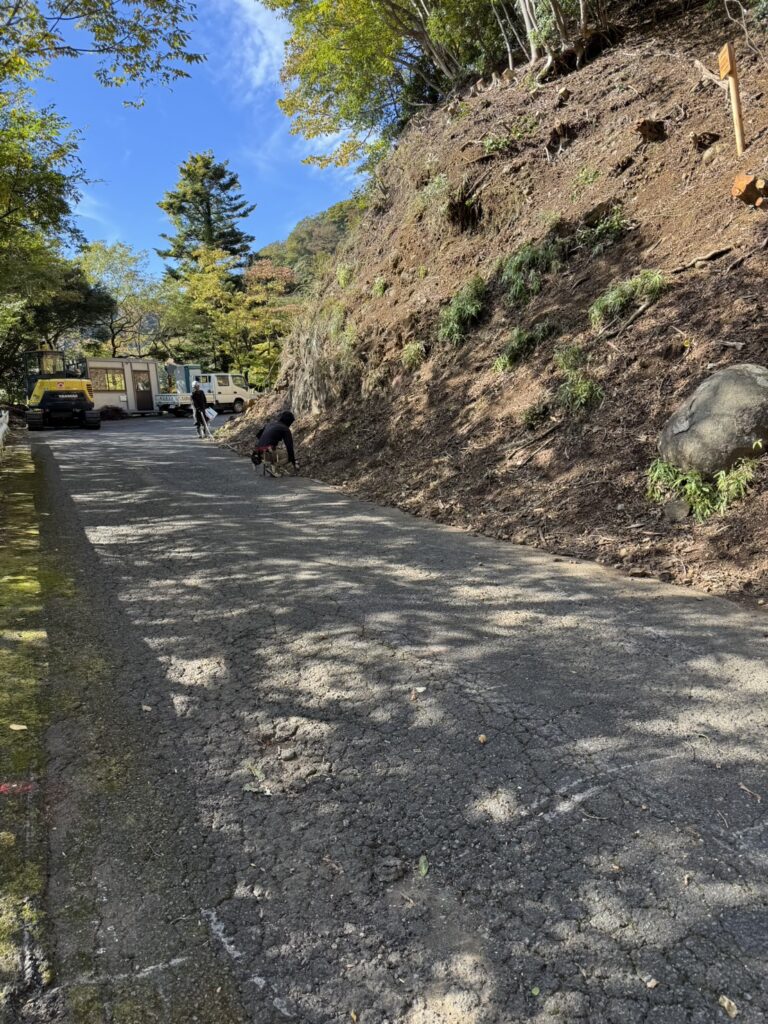 補強土壁とガードレール基礎工事が完了し、現在は影響範囲を含めた舗装工事に着手しています。